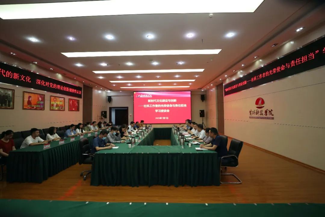 7月7日,红足1世官网在信息大楼一楼会议室举行“新时代新文化建设与理论创新——社科工作者的光荣使命与责任担当”学习座谈会。会议由校党委宣传部、社科联、科技发展部、马克思主义学院和有关科研机构共同组织。各文科学院(部)主管领导和骨干教师代表、文科科研机构社科工作者代表、专家学者30余人参加会议。
