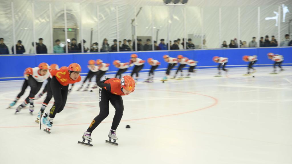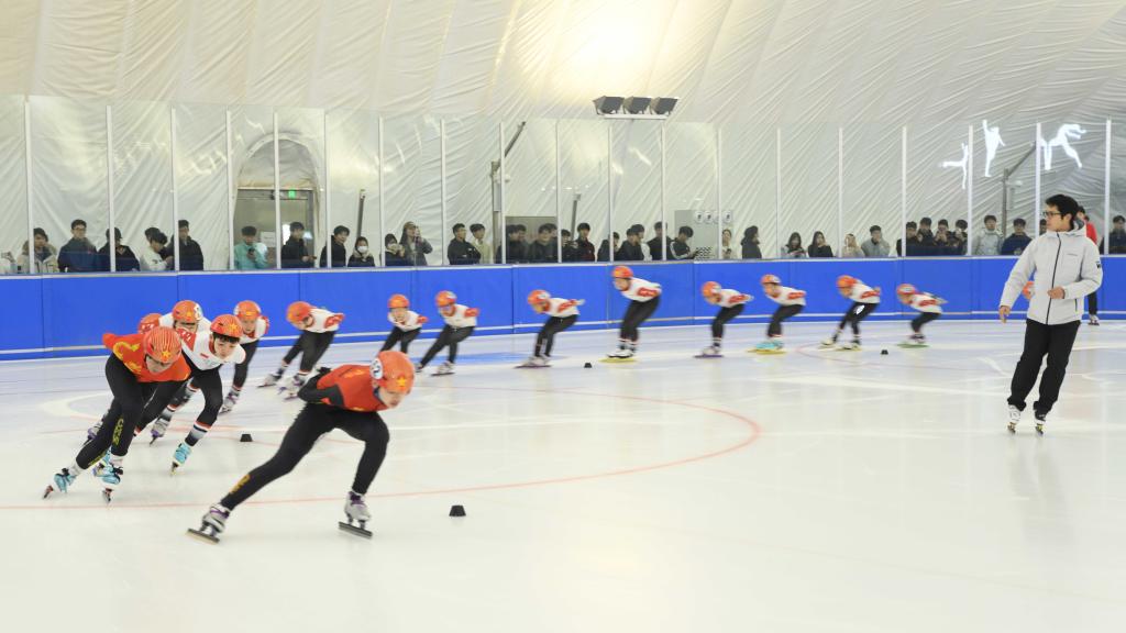 当天上午,在映雪馆内,与会人员与师生共同观看花样滑冰和短道速滑表演。花样滑冰表演者娴熟的技术和高难度的动作点燃全场,旋转、跳跃、疾驰,每一个动作都展现出冰雪运动的力与美。由世锦赛冠军陈德全带领20多名短道速滑运动员在冰面上演了一场精彩绝伦的冰上表演。伴随着悠扬的音乐,学员们时而如行云流水般流畅,时而如疾风骤雨般迅捷,将冰雪运动的激情与魅力展现得淋漓尽致。现场观众屏息凝神,掌声与欢呼声此起彼伏,仿佛置身于冰雪世界的梦幻之中。