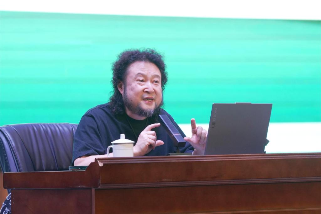 讲座现场座无虚席,气氛热烈。孟文豪结合其代表作品《亲爱的蚊子》《乌镇之恋》《绽放》《青春畅想》《最好的相伴》《山路不止十八弯》《我要醉在草原上》等,通过作品解析、创作心路分享与互动问答等形式,深入讲解了歌曲创作中主题与风格的选择、乐器表现手法的融合等关键问题。他说:“音乐创作应注重灵感的积累与表达方式的多样化探索,要善于将传统文化元素与现代音乐语言有机融合,不断拓宽艺术视野。” 孟文豪特别强调,创作的本质是真诚表达,技术服务于情感,不论流行、民族还是跨界音乐,创作者都应从真实情感出发,借助旋律、编曲等手段实现情感外化。
