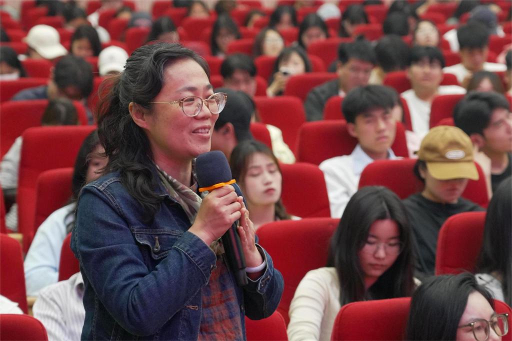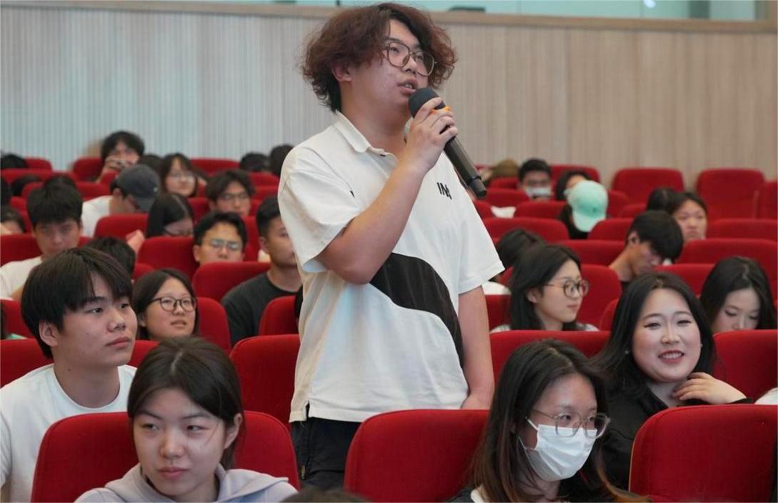 音乐科教中心教师商瑜在提问中谈及“如何快速进入创作的心流状态”,孟文豪分享了自己的感悟,他认为,首先是坚定热爱,热爱是专注与投入的前提;其次是拓宽音乐视野,多接触不同风格与类型的音乐,从而为创作注入更丰富的灵感与体验。他寄语在场学子:“要用热爱引导自己的音乐梦想,好好学习,天天向上。”