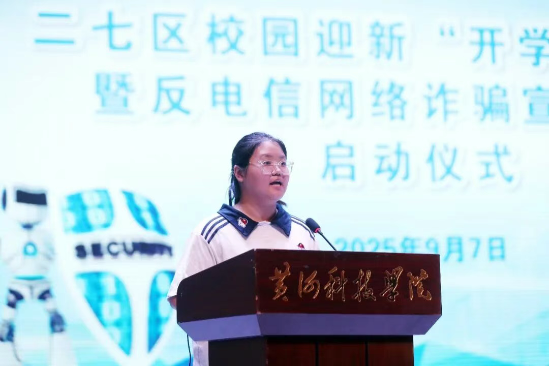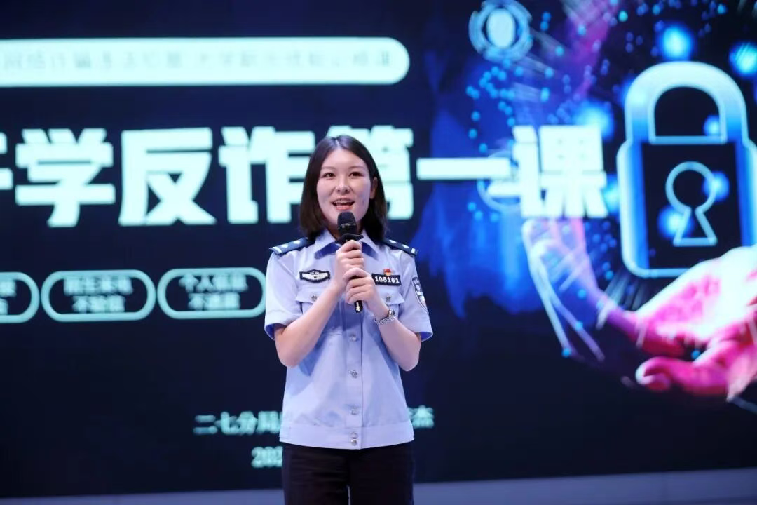 二七公安分局反诈大队胡梦杰警官作专题宣讲。她结合“校园贷”“刷单返利”“虚假客服”“游戏账号买卖”等常见骗局,剖析诈骗手法,传授防范技巧,并现场互动答疑,为新生带来一堂生动实用的“反诈第一课”。
